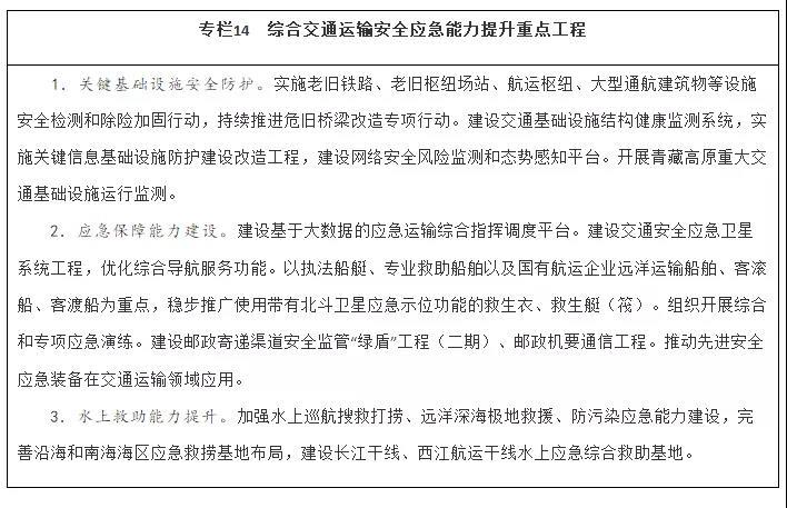 健全綜合交通運(yùn)輸應(yīng)急管理體制機(jī)制,完善應(yīng)急協(xié)調(diào)機(jī)制和應(yīng)急預(yù)案體系,加強(qiáng)交通運(yùn)輸調(diào)度與應(yīng)急指揮平臺(tái)建設(shè)。推進(jìn)區(qū)域性公路應(yīng)急裝備物資儲(chǔ)備中心建設(shè)。加強(qiáng)水上交通安全監(jiān)管、航海保障和救助打撈能力建設(shè),完善沿海和內(nèi)河溢油應(yīng)急設(shè)備庫,構(gòu)建陸海空天一體化水上交通運(yùn)輸安全保障體系。建設(shè)城市軌道交通應(yīng)急演練中心。以骨干航空物流企業(yè)為主體構(gòu)建航空應(yīng)急服務(wù)網(wǎng)絡(luò)。建設(shè)海事監(jiān)管指揮系統(tǒng)。在開展城市交通基礎(chǔ)設(shè)施地下空間、低洼區(qū)域、重點(diǎn)區(qū)段、重要點(diǎn)位、關(guān)鍵設(shè)施等隱患排查基礎(chǔ)上,建立健全風(fēng)險(xiǎn)臺(tái)賬和災(zāi)害隱患清單,補(bǔ)齊設(shè)施設(shè)備、應(yīng)急搶險(xiǎn)物資等短板,持續(xù)完善應(yīng)急處置預(yù)案,健全應(yīng)急響應(yīng)機(jī)制,提升應(yīng)對(duì)極端天氣能力。加強(qiáng)應(yīng)急專業(yè)隊(duì)伍和志愿者隊(duì)伍建設(shè),充實(shí)國家應(yīng)急運(yùn)輸儲(chǔ)備力量。健全應(yīng)對(duì)重大疫情、防范應(yīng)對(duì)恐怖襲擊、保障信息安全等非傳統(tǒng)安全應(yīng)急指揮體系和應(yīng)急交通組織。