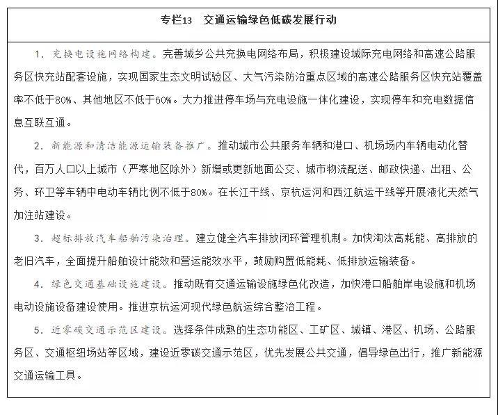 新能源和清潔能源運(yùn)輸裝備推廣。推動(dòng)城市公共服務(wù)車輛和港口、機(jī)場場內(nèi)車輛電動(dòng)化替代,百萬人口以上城市(嚴(yán)寒地區(qū)除外)新增或更新地面公交、城市物流配送、郵政快遞、出租、公務(wù)、環(huán)衛(wèi)等車輛中電動(dòng)車輛比例不低于80%。在長江干線、京杭運(yùn)河和西江航運(yùn)干線等開展液化天然氣加注站建設(shè)。