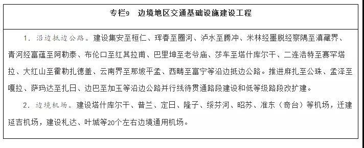 服務(wù)沿邊城鎮(zhèn)體系建設(shè),以公路、機(jī)場為重點(diǎn),大力改善邊境地區(qū)交通出行條件,提升邊境城鎮(zhèn)人口集聚能力。統(tǒng)籌推進(jìn)邊境地區(qū)國省干線公路、農(nóng)村公路等建設(shè),全面完善國道干線主骨架,推進(jìn)沿邊公路并行線建設(shè)和低等級(jí)公路提質(zhì)改造,加快抵邊公路建設(shè),盡快形成層次清晰、結(jié)構(gòu)合理的沿邊公路網(wǎng)。穩(wěn)步推進(jìn)邊境地區(qū)機(jī)場建設(shè),構(gòu)建多層級(jí)航空網(wǎng),擴(kuò)大航空運(yùn)輸服務(wù)覆蓋面。補(bǔ)強(qiáng)同江、二連浩特、阿拉山口、霍爾果斯、瑞麗、磨憨等口岸后方鐵路通道能力。加強(qiáng)抵邊自然村郵政設(shè)施建設(shè),實(shí)現(xiàn)郵政服務(wù)普遍覆蓋。