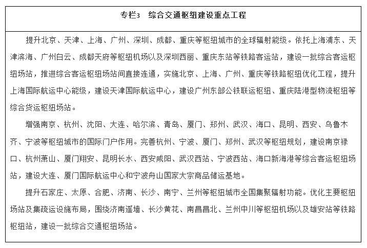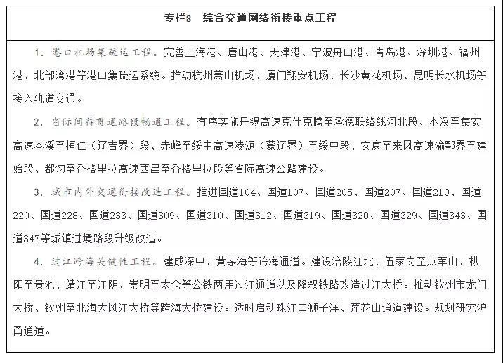 加快解決制約人民美好出行、貨物高效流通的瓶頸,強(qiáng)化綜合交通網(wǎng)絡(luò)有機(jī)銜接。打通公路省際待貫通路段,加強(qiáng)干線公路與城市道路有效銜接,推進(jìn)城鎮(zhèn)密集地區(qū)干線公路過境段、進(jìn)出城瓶頸路段升級(jí)改造。加強(qiáng)樞紐機(jī)場與軌道交通高效銜接,使換乘更加便捷。強(qiáng)化進(jìn)港區(qū)、進(jìn)園區(qū)、進(jìn)廠區(qū)、進(jìn)規(guī)?;r(nóng)產(chǎn)品基地等集疏運(yùn)設(shè)施建設(shè),加快推動(dòng)鐵路進(jìn)港口重點(diǎn)港區(qū)和大型工礦企業(yè)、物流園區(qū)、重點(diǎn)物資儲(chǔ)備庫。統(tǒng)籌考慮資源高效利用、生態(tài)環(huán)境保護(hù)和防洪航運(yùn)安全,有序建設(shè)各種運(yùn)輸方式共享通道資源的過江跨海通道。推動(dòng)超大特大城市的大型綜合客運(yùn)樞紐間通過軌道交通互連。加快實(shí)現(xiàn)聯(lián)系緊密的綜合貨運(yùn)樞紐間通過聯(lián)絡(luò)線或?qū)S猛ǖ阑ミB。
