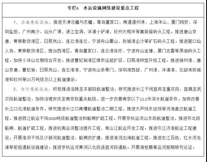 優(yōu)化暢通水運(yùn)設(shè)施網(wǎng)絡(luò)。建設(shè)京津冀、長三角、粵港澳大灣區(qū)世界級(jí)港口群,支持山東打造世界一流的海洋港口,推進(jìn)東北地區(qū)沿海港口一體化發(fā)展,優(yōu)化港口功能布局,推動(dòng)資源整合和共享共用。有序推進(jìn)沿海港口專業(yè)化碼頭及進(jìn)出港航道等公共設(shè)施建設(shè)。適度超前建設(shè)糧食、能源、礦產(chǎn)資源的接卸、儲(chǔ)存、中轉(zhuǎn)設(shè)施,推進(jìn)沿海沿江液化天然氣碼頭規(guī)劃建設(shè)。提升內(nèi)河港口專業(yè)化、規(guī)?;?,合理集中布局集裝箱、煤炭、鐵礦石、商品汽車等專業(yè)化碼頭。加強(qiáng)內(nèi)河高等級(jí)航道擴(kuò)能升級(jí)與暢通攻堅(jiān)建設(shè),完善長江、珠江、京杭運(yùn)河和淮河等水系內(nèi)河高等級(jí)航道網(wǎng)絡(luò),進(jìn)一步提升珠三角高等級(jí)航道網(wǎng)出海能力,全面加強(qiáng)長三角、珠江—西江高等級(jí)航道網(wǎng)未達(dá)標(biāo)段建設(shè)。推動(dòng)重要支流航道和庫湖區(qū)航道、內(nèi)河旅游航道、便民碼頭建設(shè)。