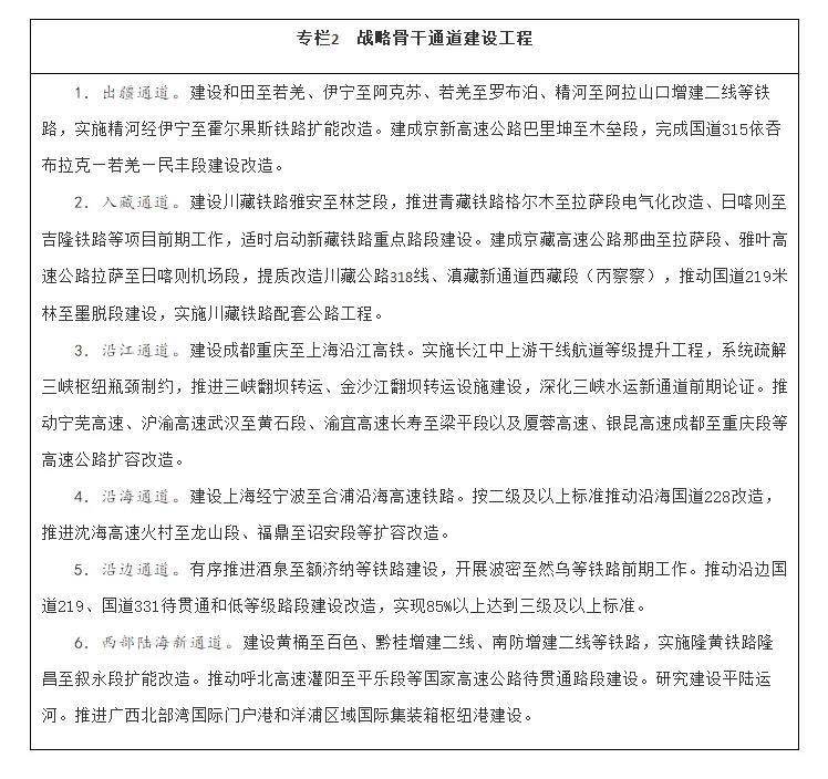 加強(qiáng)戰(zhàn)略骨干通道建設(shè)。推進(jìn)出疆入藏通道建設(shè),擴(kuò)大甘新、青新、青藏、川藏四條內(nèi)聯(lián)主通道通行能力,穩(wěn)步推進(jìn)川藏鐵路建設(shè),加快推進(jìn)新藏鐵路和田至日喀則段前期工作、適時(shí)啟動(dòng)重點(diǎn)路段建設(shè),有序推進(jìn)滇藏鐵路前期工作,密實(shí)優(yōu)化航空航線網(wǎng)絡(luò)布局,構(gòu)建多向聯(lián)通的通道布局。暢通沿江通道,加快建設(shè)沿江高鐵,優(yōu)化以高等級(jí)航道和干線鐵路、高速公路為骨干的沿江綜合運(yùn)輸大通道功能。升級(jí)沿海通道,提高鐵路通道能力,推進(jìn)高速公路繁忙路段擴(kuò)容改造,提升港口航道整體效能,構(gòu)建大容量、高品質(zhì)的運(yùn)輸走廊。貫通沿邊通道,提級(jí)改造普通國省干線,推進(jìn)重點(diǎn)方向沿邊鐵路建設(shè),提高安全保障水平。建設(shè)西部陸海新通道,發(fā)揮鐵路在陸路運(yùn)輸中的骨干作用和港口在海上運(yùn)輸中的門戶作用,強(qiáng)化東、中、西三條通路,形成大能力主通道,銜接國際運(yùn)輸通道。
