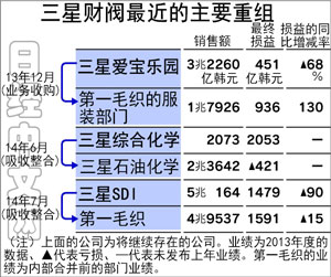 三星加速重組的原因是集團業(yè)績快速惡化。據(jù)韓國公正交易委員會統(tǒng)計,13年度三星財閥整體的純利潤為24萬億韓元,比上一年度減少了18%。