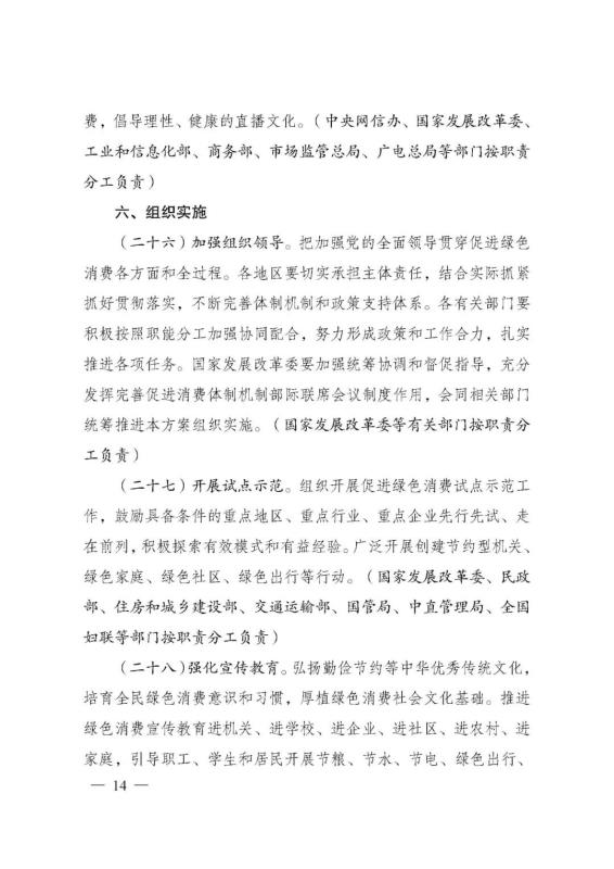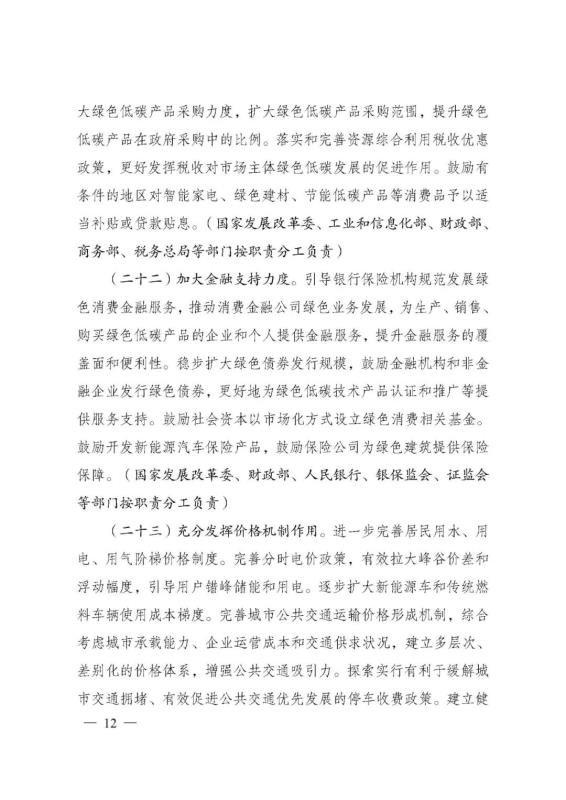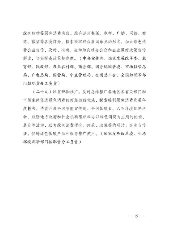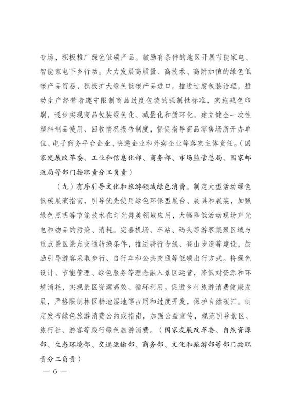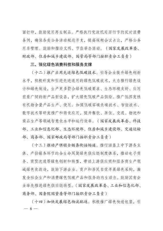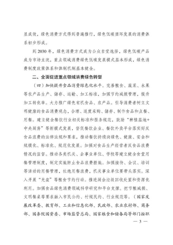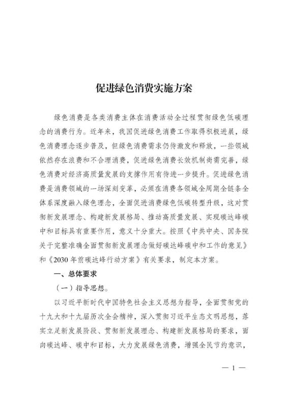 為深入貫徹落實(shí)《中共中央、國(guó)務(wù)院關(guān)于完整準(zhǔn)確全面貫徹新發(fā)展理念做好碳達(dá)峰碳中和工作的意見》和《2030年前碳達(dá)峰行動(dòng)方案》有關(guān)要求,根據(jù)碳達(dá)峰碳中和工作領(lǐng)導(dǎo)小組部署安排,國(guó)家發(fā)展改革委、工業(yè)和信息化部、住房和城鄉(xiāng)建設(shè)部、商務(wù)部、市場(chǎng)監(jiān)管總局、國(guó)管局、中直管理局會(huì)同有關(guān)部門研究制定了《促進(jìn)綠色消費(fèi)實(shí)施方案》?,F(xiàn)印發(fā)給你們,請(qǐng)結(jié)合實(shí)際,認(rèn)真抓好貫徹落實(shí)。