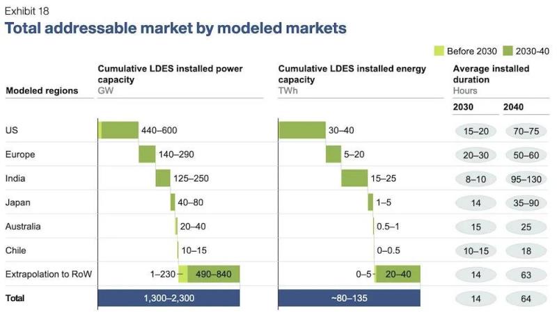 在澳大利亞,如下圖所示,該報(bào)告顯示,從2030年到2040 年,長時(shí)儲(chǔ)能的總潛在市場在20-40GW和0.5-1 TWh之間。