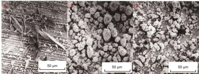 向電解液中加入添加劑是抑制鋅枝晶的常用手段,添加劑的存在能夠直接影響晶核的形成和生長(zhǎng),添加劑主要分為三類:聚合物、有機(jī)分子和金屬離子。聚合物容易吸附在晶核周圍,延緩晶核生長(zhǎng)的速度,反向促進(jìn)鋅離子在其他部位的成核和生長(zhǎng),有助于沉積層的均一化。Banik等研究了通過(guò)添加聚乙烯亞胺(PEI)有效改善鋅枝晶的過(guò)程,如圖8所示,當(dāng)電解液沒(méi)有添加PEI時(shí),鋅沉積后形成了典型的鋸齒狀枝晶;在加入10 ppm(1 ppm=10-6)PEI后,鋅沉積形成了球狀和圓形枝晶尖端,且尺寸明顯減小,極大削弱了對(duì)電池隔膜的威脅。但隨著添加劑量的增加,負(fù)極極化也越來(lái)越嚴(yán)重,因此,在選擇添加劑時(shí),也需要平衡添加劑的量與電池性能之間的關(guān)系。與聚合物相比,有機(jī)分子具有更短的鏈和更小的位阻,從而具有更高的靈活性。Li等在鋅電解液中加入了乙醇(EtOH),改善了鋅表面的沉積粒度,抑制了枝晶形成的過(guò)程。作者認(rèn)為,由于EtOH與鋅的配位作用,增加了鋅鍍層的過(guò)電位,從而降低了交換電流密度,使得沉積層更為平整。金屬離子作為添加劑加入到電解液中,也可以抑制鋅枝晶的生長(zhǎng),值得注意的是,金屬離子與有機(jī)分子的協(xié)同作用對(duì)于抑制鋅枝晶效果更好。Wang等分別研究了空白溶液、添加Bi3+、同時(shí)添加Bi3+和TBAB后對(duì)鋅枝晶的影響,結(jié)果表明,Bi3+與TBAB的協(xié)同作用使鋅沉積后,形成了致密的顆粒沉積層,如圖9所示。