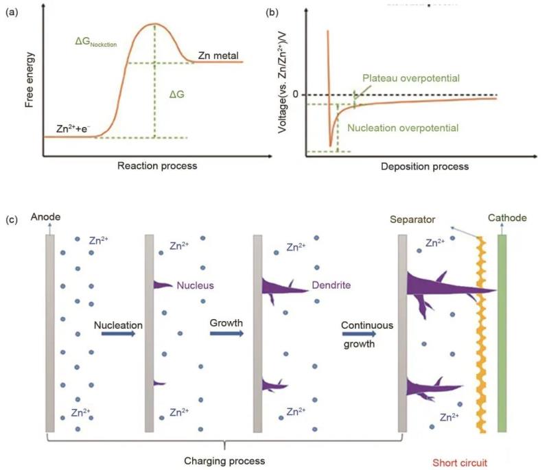 圖7 (a) 鋅成核過(guò)程中的能壘;(b) 鋅新增長(zhǎng)過(guò)程中的過(guò)電勢(shì);(c) 鋅枝晶形成過(guò)程中鋅成核、鋅增長(zhǎng)示意圖