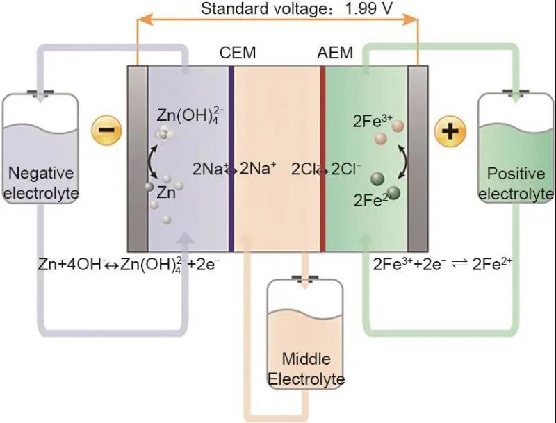 圖12 無(wú)枝晶-堿性鋅鐵液流電池示意圖