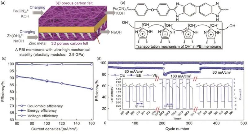 2018年,Yuan等報(bào)道了一種高性能、長(zhǎng)循環(huán)壽命的堿性鋅鐵液流電池。該電池分別以Zn(OH)42-/Zn和F(CN)63-/Fe(CN)64-作為負(fù)極和正極的氧化還原電對(duì),采用了自制的聚苯并咪唑(PBI)膜,并與三維多孔碳?xì)蛛姌O相結(jié)合組成液流電池,如圖2所示。帶有雜環(huán)的PBI膜可確保羥基離子的快速運(yùn)輸,同時(shí),由于PBI膜具有較強(qiáng)的機(jī)械穩(wěn)定性,可以很好地抵抗鋅枝晶,從而保證了堿性鋅鐵液流電池的長(zhǎng)期循環(huán)穩(wěn)定性。此外,三維多孔碳?xì)志哂休^高孔隙率和比表面積,能夠?yàn)殇\的沉積與剝落提供場(chǎng)所,有效抑制鋅枝晶和聚集,保證了電池具有出色的循環(huán)穩(wěn)定性和倍率性能。該課題組通過(guò)優(yōu)化電解液的組成,使Fe(CN)63-/Fe(CN)64-氧化還原對(duì)的濃度達(dá)到1 mol/L,遠(yuǎn)超以往報(bào)道的濃度(0.4 mol/L),使電池具有了更高的能量密度。該電池在80 mA/cm2和160 mA/cm2電流密度下可實(shí)現(xiàn)充放電500個(gè)循環(huán),且在160 mA/cm2時(shí)仍保持能量效率(EE)大于80%。