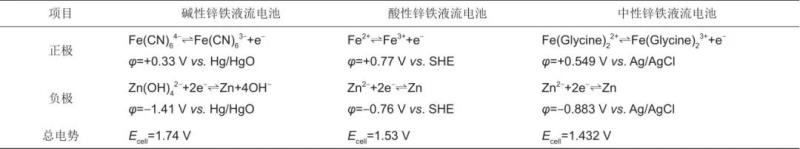 與其他鋅基液流電池不同,鋅鐵液流電池電解液可以在很寬的pH范圍內(nèi)工作。因此,根據(jù)電解液酸堿性的不同,鋅鐵液流電池可以分為堿性、酸性和中性鋅鐵液流電池三類,如表1所示。