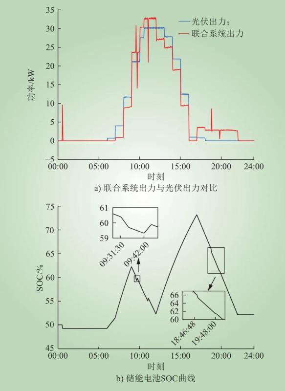 在圖5所示仿真環(huán)境下,依據(jù)本文所提綜合控制策略,光儲系統(tǒng)出力情況如圖6a)所示,儲能電池荷電狀態(tài)如圖6b)所示。