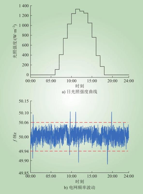 根據(jù)圖1搭建光儲系統(tǒng)仿真模型。其中光伏電池滿發(fā)功率為30 kW,儲能電池額定容量為300 A·h,額定參考功率為10 kW,逆變器容量為30 kW,且有10%的過載能力,即逆變器最大功率為33 kW。設(shè)置 SOCmax=95% , SOCmin=5% ,考慮到一天中儲能電池在調(diào)頻模式下動作時間短,設(shè)置調(diào)頻預(yù)留容量為儲能電池容量的10%,即 SOChigh=85% , SOClow=15% 。設(shè)置典型日環(huán)境溫度為25 °C ,日光照強(qiáng)度曲線如圖5a)所示,電網(wǎng)頻率波動如圖5b)所示。
