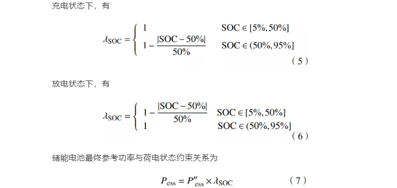 (2)當(dāng)儲能電池荷電狀態(tài)較低時(SOC<50%),按照 P′′ess 進(jìn)行充電,當(dāng)充電到儲能電池荷電狀態(tài)較高時(SOC>50%),為充分利用儲能電池容量以及避免過充,儲能電池以 P′′ess 乘以一個小于1的 λSOC 進(jìn)行充電,且 λSOC 隨荷電狀態(tài)上升而減小。