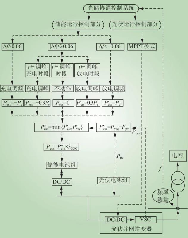 根據(jù)電網(wǎng)頻率不同,儲能電池可工作于調(diào)頻/調(diào)峰2種工作模式。在這2種模式下,光儲系統(tǒng)的控制包括3個主要環(huán)節(jié):(1)光伏系統(tǒng)采用最大功率跟蹤(maximum power point tracking, MPPT)控制,光儲協(xié)調(diào)控制系統(tǒng)檢測電網(wǎng)頻率,判定頻率是否處于調(diào)頻死區(qū)。(2)電網(wǎng)頻率處于調(diào)頻死區(qū)內(nèi)時,儲能電池運(yùn)行于調(diào)峰模式,此時依據(jù)調(diào)峰時段,控制儲能電池充放電;電網(wǎng)頻率超出調(diào)頻死區(qū)時,儲能電池運(yùn)行于調(diào)頻模式,根據(jù)頻率偏移方向得到儲能電池初級參考功率。(3)與逆變器空閑容量比較,取兩者中較小值作為儲能電池次級參考功率,經(jīng)儲能電池最大出力約束系數(shù)優(yōu)化后作為儲能電池最終參考功率。得到綜合控制策略流程如圖2所示。
