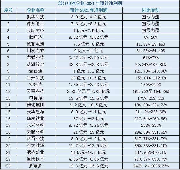 同樣因為六氟磷酸鋰產(chǎn)品產(chǎn)銷量大幅增長,以及市場對六氟磷酸鋰的需求大增,導(dǎo)致六氟磷酸鋰市場銷售價格上漲,天際材料實現(xiàn)扭虧為盈。此外,德方納米、振華科技也在去年實現(xiàn)扭虧為盈。