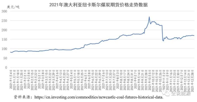 澳大利亞紐卡斯?fàn)?021年煤炭期貨價格均價為每噸136.68美元,最高價為每噸269.50美元,最低價為每噸79.30美元,高低價差達每噸190.20美元。1月4日,澳煤的開盤價為每噸82.50美元,以2021年10月5日的最高價269.50美元計算,上漲了3.27倍;以12月31日的收盤價169.90美元計算,上漲了2.06倍。