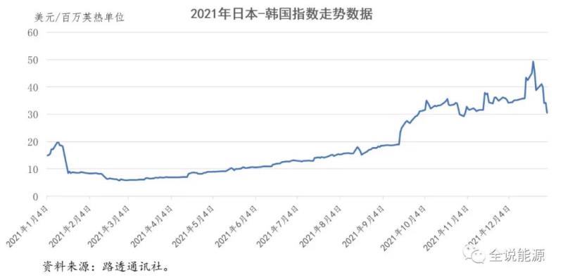 日韓指數(shù)2021年均價為每百萬英熱單位18美元。1月4日,日韓指數(shù)的開盤價為每百萬英熱單位14.93美元,12月31日的收盤價為30.50美元,2021年日韓指數(shù)上漲了15.57美元,上漲了2.04倍;以12月21日的最高價計算,日韓指數(shù)上漲了34.42美元,上漲了3.3倍。以2月25日的每百萬英熱單位5.81美元的最低價計算,高低價差達43.54美元。