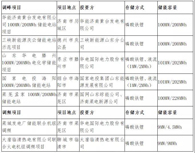 山東省在全國率先發(fā)布了省級儲能指導意見《關(guān)于開展儲能示范應用的實施意見》,在實施意見中發(fā)布了儲能參與輔助服務、租賃給新能源場站、獎勵優(yōu)先發(fā)電量計劃的組合政策,確定了充放電量損耗部分按工商業(yè)及其他用電單一制電價結(jié)算的方式,初步建立了盈利模式,由此帶動了示范項目的建設(shè)。首批五加二示范項目如下表: