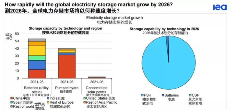 在系統(tǒng)靈活性需求的推動下,全球存儲容量擴(kuò)大了56%。由于報(bào)酬計(jì)劃和長期目標(biāo),中國在所有技術(shù)的擴(kuò)張中占主導(dǎo)地位。抽水蓄能電站(PSH)仍然是存儲能力的最大來源。