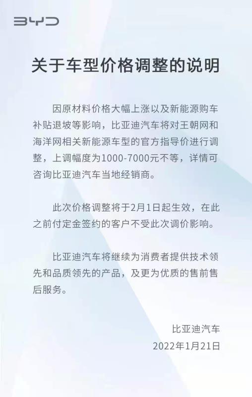 中國(guó)儲(chǔ)能網(wǎng)訊:1月21日,貝殼財(cái)經(jīng)記者從比亞迪官方獲悉,因原材料價(jià)格大幅上漲以及新能源購(gòu)車(chē)補(bǔ)貼退坡等影響,比亞迪汽車(chē)將對(duì)王朝網(wǎng)和海洋網(wǎng)相關(guān)新能源車(chē)型的官方指導(dǎo)價(jià)進(jìn)行調(diào)整,上調(diào)幅度為1000-7000元不等。此次價(jià)格調(diào)整將于2月1日起生效,在此之前付定金簽約的客戶(hù)不受此次調(diào)價(jià)影響。