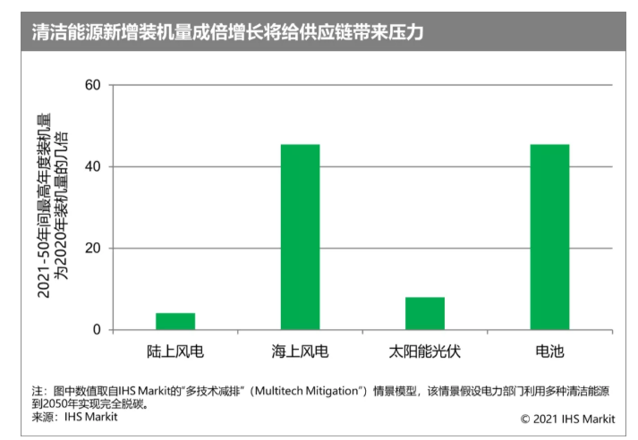 如若電力部門真能引領一場全面的全球能源轉型,那么根據(jù)埃信華邁(IHS Markit)提出的其中一個深度脫碳情景,2021-2050年間全球可能需要增加約280億千瓦的清潔發(fā)電能力,也就是年均新增清潔發(fā)電容量要比過去10年的年均水平高出5.5倍,實現(xiàn)這一目標所需的總投資額約為30-40萬億美元。