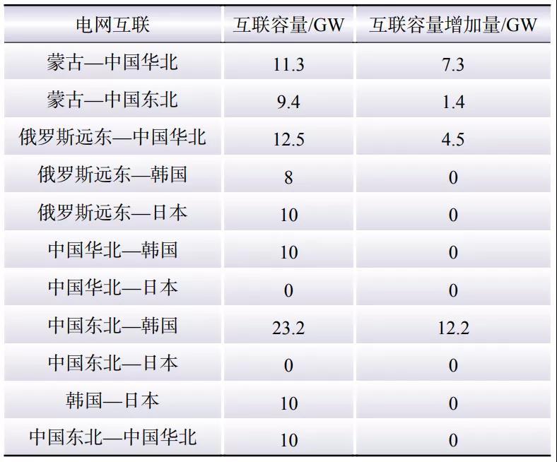 (3)在情景0優(yōu)化結(jié)果的基礎(chǔ)上,增加送受端系統(tǒng)之間的電網(wǎng)互聯(lián)容量,作為新的邊界條件,重新優(yōu)化東北亞6區(qū)域的新能源、電網(wǎng)和儲(chǔ)能容量,論述電網(wǎng)互聯(lián)布局和容量規(guī)劃問(wèn)題,形成情景2。