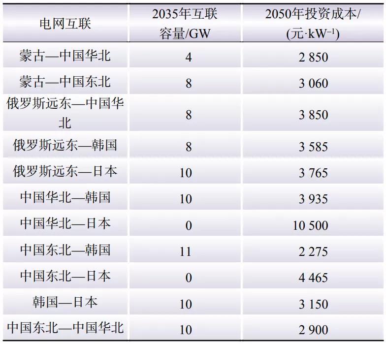 電網(wǎng)互聯(lián)和成本方面,東北亞6區(qū)域2035年的電網(wǎng)互聯(lián)結(jié)構(gòu)和容量、2050年電網(wǎng)單位投資成本如表6所示。電網(wǎng)布局及送受電特性示意如圖1所示,總體來(lái)看,蒙古和俄羅斯遠(yuǎn)東為送端系統(tǒng),韓國(guó)、日本為受端系統(tǒng),根據(jù)各區(qū)域電網(wǎng)的送受電特性對(duì)2050年新建電網(wǎng)互聯(lián)容量進(jìn)行優(yōu)化規(guī)劃。