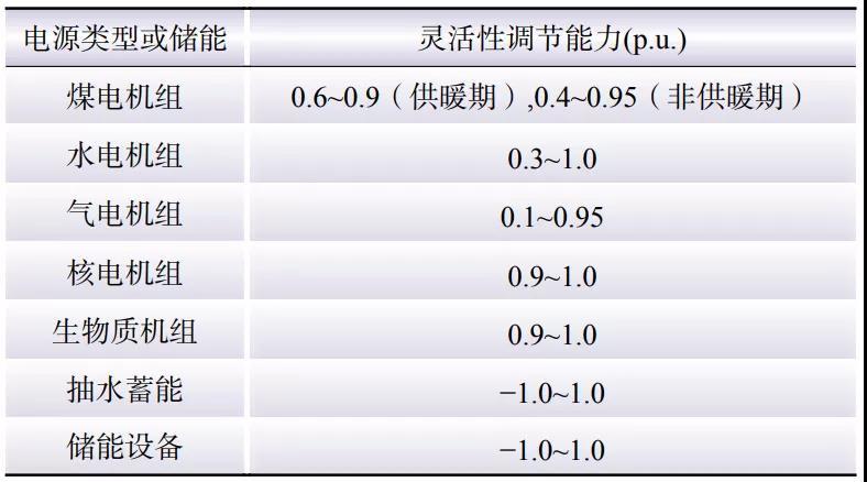 表4 不同類(lèi)型電源及儲(chǔ)能的靈活調(diào)節(jié)能力