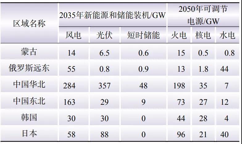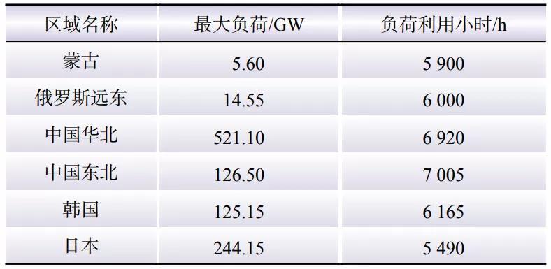 負(fù)荷方面,基于東北亞蒙古、俄羅斯遠(yuǎn)東、中國(guó)華北、中國(guó)東北、韓國(guó)、日本6大區(qū)域2050年的最大負(fù)荷預(yù)測(cè)(見(jiàn)表1)和歷史負(fù)荷特性,得到6大區(qū)域2050年的全年逐小時(shí)負(fù)荷特性曲線(xiàn)。