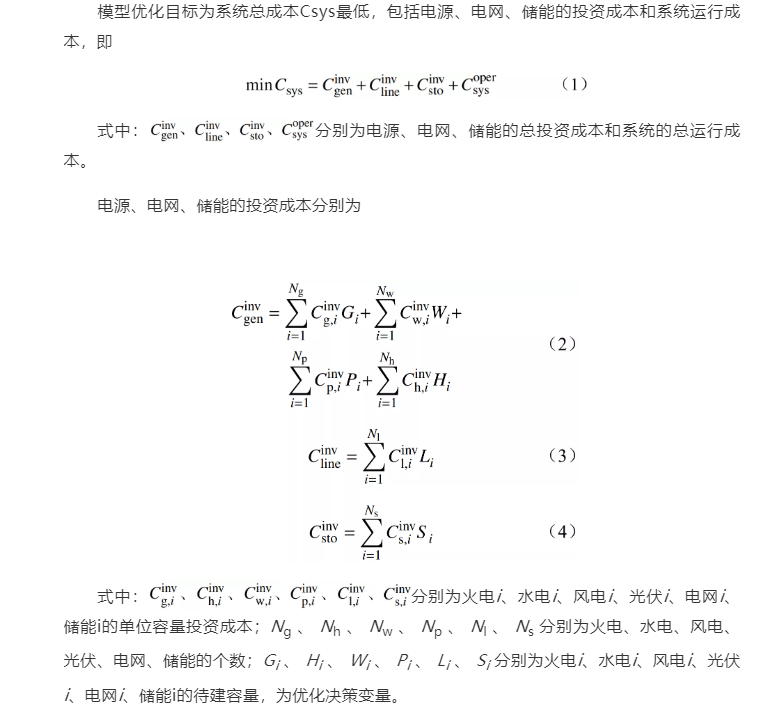 (3)在優(yōu)化計(jì)算和分析模塊,開(kāi)展全年時(shí)序生產(chǎn)運(yùn)行模擬,保證系統(tǒng)供電充裕度和電力電量平衡,達(dá)到系統(tǒng)總成本最低。優(yōu)化求解新增的風(fēng)電、光伏新能源電源裝機(jī)、電網(wǎng)互聯(lián)及儲(chǔ)能容量,分析新能源電源、互聯(lián)電網(wǎng)及儲(chǔ)能三者之間的關(guān)系。