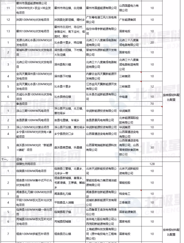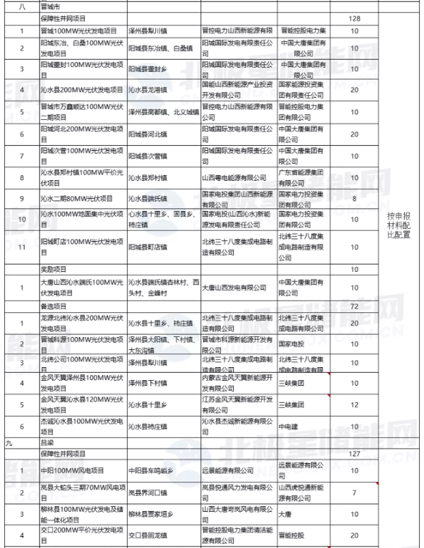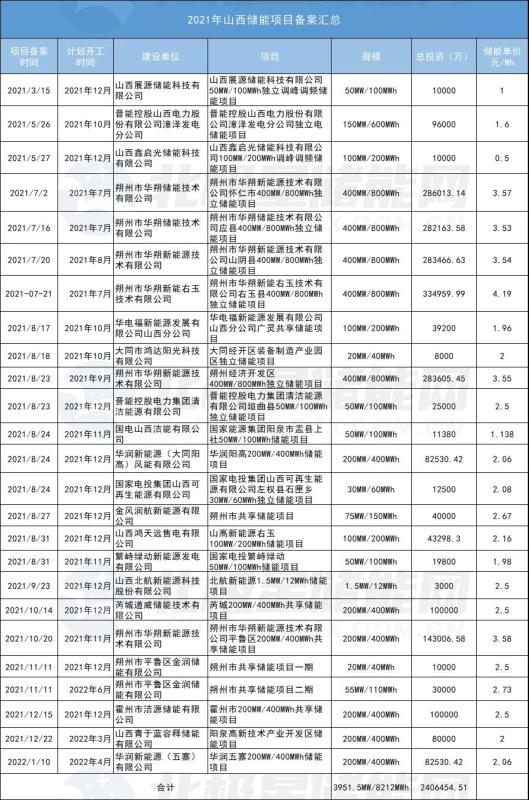 此前2021年10月22日,山西省能源局發(fā)布《關(guān)于下達(dá)山西省 2021年風(fēng)電、光伏發(fā)電保障性并網(wǎng)年度建設(shè)計(jì)劃的通》。風(fēng)、光合計(jì)17.792GW,其中保障性11.2GW+獎(jiǎng)勵(lì)700MW+備選5.892GW,文件項(xiàng)目列表中風(fēng)電配置10%儲(chǔ)能,光伏配置10%-15%儲(chǔ)能,除了未公布的儲(chǔ)能配比之外,儲(chǔ)能裝機(jī)量達(dá)469.5MW。由此可見(jiàn),目前已經(jīng)備案的儲(chǔ)能項(xiàng)目基本上就已經(jīng)滿足了風(fēng)光發(fā)電項(xiàng)目要求。