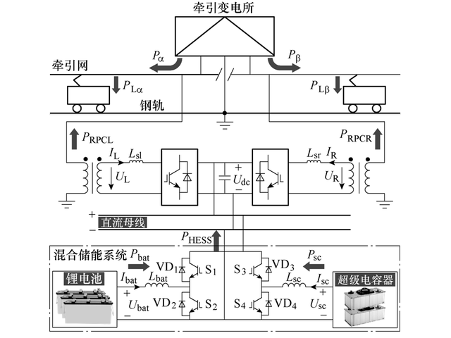 近年來,由兩種或兩種以上儲(chǔ)能介質(zhì)所構(gòu)成的混合儲(chǔ)能系統(tǒng)(Hybrid Energy Storage System, HESS)成為國內(nèi)外學(xué)者研究的熱點(diǎn),其中,鋰電池和超級(jí)電容器在性能上具有很強(qiáng)的互補(bǔ)性,被大量地使用在混合儲(chǔ)能系統(tǒng)中。目前,混合儲(chǔ)能系統(tǒng)已在微電網(wǎng)、城市軌道交通和電動(dòng)汽車等領(lǐng)域得到廣泛的運(yùn)用,但其在電氣化鐵路中的應(yīng)用研究卻相對(duì)較少。