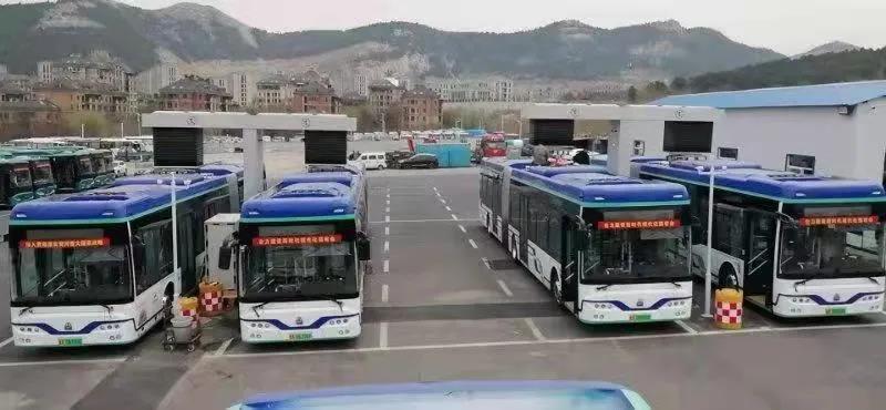 2021年秋天,在山東濟南公交媒體村公交充電站,4輛公交車正在使用充電弓進行充電。