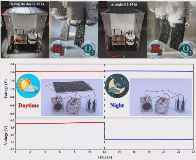 團隊鐘耀棠等構(gòu)建了一種高效低成本的制氫新體系,該體系由太陽能電池板發(fā)電、可充電鋅-空氣電池儲電和電解槽電解水制氫等三部分構(gòu)成。制備出能同時適用于氫析出(HER)、氧析出(OER)與氧還原(ORR)反應(yīng)的非貴金屬催化材料(Co-NC@CC)。實驗結(jié)果表明,所構(gòu)建的電解水制氫系統(tǒng)可實現(xiàn)24 h無間斷高效穩(wěn)定制氫。在氙燈1500 W/m2光功率密度的照射下,其太陽能-氫轉(zhuǎn)化效率(STH,solar to H2)高達18.43%,接近低成本吸光材料驅(qū)動電解水產(chǎn)氫體系的最高紀錄(18.7%)。這種利用太陽能驅(qū)動的新型高效低成本電解水制氫系統(tǒng)實現(xiàn)了氫能生產(chǎn)清潔化,為制氫技術(shù)的可持續(xù)發(fā)展提供了可靠途徑。成果” Efficient water splitting system enabled by multifunctional platinum-free electrocatalysts”發(fā)表在Adv. Funct. Mater. 2021, 31, 2009853上。