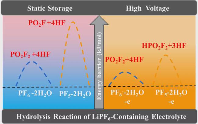 團隊邢麗丹教授、劉明珠等提出了鋰離子電池中氫氟酸(HF)產(chǎn)生的新機理。在鋰離子電池的使用過程中,含有LiPF6的電解液會發(fā)生水解反應(yīng),產(chǎn)生HF。HF會進一步腐蝕電極/電解液界面膜,進而導(dǎo)致電池性能下降。然而,商用電解液的水解機理并不明確,導(dǎo)致抑制電解液水解的研究進展緩慢。該團隊利用分子動力學(xué)模擬,量子化學(xué)計算和實驗研究相結(jié)合,闡明了電解液的水解機制,并提出了抑制水解反應(yīng)的解決方案。該成果“Hydrolysis of LiPF6?Containing Electrolyte at High Voltage” 發(fā)表在ACS Energy Lett. 2021, 6, 2096-2102上。