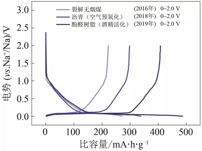 為了獲得比容量更高的下一代碳類(lèi)負(fù)極,作者團(tuán)隊(duì)深入研究了無(wú)定形碳的儲(chǔ)Na機(jī)理,并基于對(duì)機(jī)理的理解,通過(guò)多種方式調(diào)控了碳的微結(jié)構(gòu),進(jìn)一步提升了碳類(lèi)材料的比容量。瀝青是一種價(jià)格低廉的石油工業(yè)殘?jiān)?,在公路鋪設(shè)、房屋修補(bǔ)等方面有廣泛使用,但按照傳統(tǒng)高溫處理法制備的樣品可逆比容量不足100 mA·h/g。作者團(tuán)隊(duì)通過(guò)簡(jiǎn)單的在空氣中低溫預(yù)氧化和在惰性氣氛中高溫碳化的方法,可以將可逆比容量提高到約300 mA·h/g。預(yù)氧化過(guò)程中引入了含氧官能團(tuán),以抑制瀝青高溫結(jié)構(gòu)有序重排,從而達(dá)到提升微結(jié)構(gòu)無(wú)序度進(jìn)而提升儲(chǔ)鈉容量的目的。進(jìn)一步地,作者團(tuán)隊(duì)利用酚醛樹(shù)脂(塑料、加工行業(yè)常用原材料,也稱(chēng)電木)作為前驅(qū)體、乙醇作為造孔劑,通過(guò)形成閉合孔隙的策略來(lái)精確調(diào)控硬碳微觀(guān)結(jié)構(gòu),得到的硬碳負(fù)極可逆比容量約為410 mA·h/g,甚至超過(guò)了石墨的儲(chǔ)鋰容量。以上3代碳類(lèi)負(fù)極材料的首周充放電曲線(xiàn)如圖3所示。