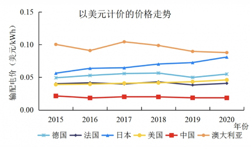 從價(jià)格水平來(lái)看,與歐美等典型國(guó)家相比較,我國(guó)輸配電價(jià)處于較低水平。2020年,美國(guó)、中國(guó)、法國(guó)、德國(guó)等國(guó)家(地區(qū))輸配電價(jià)水平為0.018~0.088美元/(kWh),平均輸配電價(jià)0.041美元/(kWh),我國(guó)的輸配電價(jià)為0.027美元/(kWh)]。