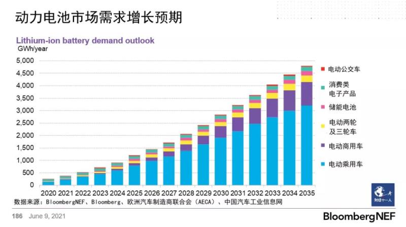 根據(jù)BloombergNEF今年6月最新的預(yù)估,到2030年,全球動(dòng)力電池的需求量將達(dá)到2700GWh,這一預(yù)測(cè)與去年同期的預(yù)測(cè)相比增加了35%,相比于2020年全球鋰電池裝機(jī)量137GWh,10年時(shí)間,將增長(zhǎng)近20倍。其中最大的增量來(lái)自于乘用車的動(dòng)力電池。
