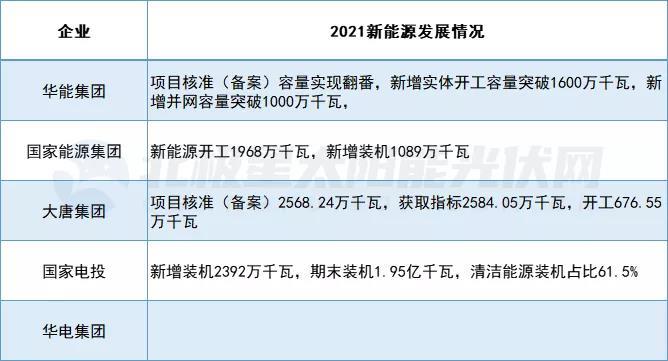 作為新能源領(lǐng)域的主力軍,五大發(fā)電集團(tuán)2021年在新能源領(lǐng)域的成績單也異常亮眼,公開數(shù)據(jù)顯示:2021年,華能集團(tuán)實(shí)現(xiàn)新能源新增并網(wǎng)超1000萬千瓦,實(shí)體開工超1600萬千瓦、國家能源集團(tuán)新能源開工1968萬千瓦,新增裝機(jī)1089萬千瓦、大唐集團(tuán)新能源項(xiàng)目核準(zhǔn)(備案)2568.24萬千瓦,獲取指標(biāo)2584.05萬千瓦......無一例外都創(chuàng)歷史最好水平。