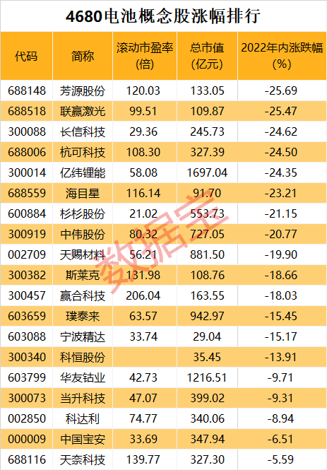 證券時報·數據寶統(tǒng)計,從2022年行情來看,4680電池概念股受整個電池板塊回調影響,個股普跌,芳源股份、聯(lián)贏激光、長信科技等概念股跌幅均超20%。部分概念股布局動作不斷。
