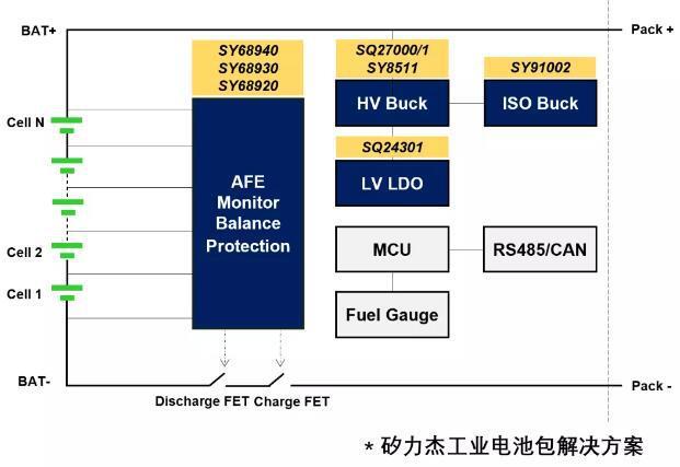 工業(yè)電池包主要由AFE,MCU,接口和電源管理等部分構(gòu)成。AFE主要完成電池檢測(cè)(電壓,電流,溫度),均衡和保護(hù)的功能,是整個(gè)BMS系統(tǒng)的核心器件。矽力杰提供高精密高串?dāng)?shù)的AFE方案和高效率高功率密度的電源管理方案。