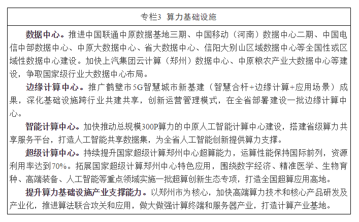 對于數(shù)據(jù)中心建設(shè),《規(guī)劃》提出,統(tǒng)籌布局算力基礎(chǔ)設(shè)施,推動算力、算法、數(shù)據(jù)、應(yīng)用資源集約化和服務(wù)化創(chuàng)新,加快算力協(xié)作、算力路由、算力交易等算力網(wǎng)絡(luò)基礎(chǔ)設(shè)施建設(shè),構(gòu)建存儲+邊緣計算+智算+超算多元協(xié)同、數(shù)智融合的算力體系,建設(shè)中部地區(qū)計算能力最強(qiáng)、數(shù)據(jù)應(yīng)用最廣、安全等級最高的算力基礎(chǔ)設(shè)施集群,打造中原算力網(wǎng)。