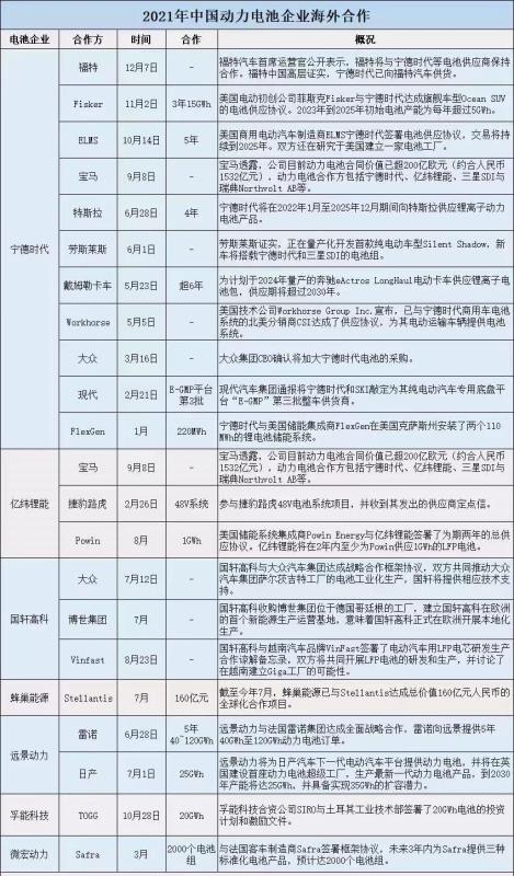 2021年,寧德時代與現(xiàn)代、大眾、戴姆勒卡車、特斯拉、寶馬、Fisker等國際車企合作或加大合作;遠景動力攜手雷諾與日產英法“落子”;億緯鋰能拿下捷豹路虎48V定點以及美國儲能大單;國軒高科為大眾提供技術支持,并建立其在歐洲的首個新能源生產運營基地。