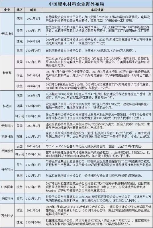 基于此,包括天賜材料、新宙邦、科達利、天奈科技、當升科技、恩捷股份、江蘇國泰、龍蟠科技、石大勝華等鋰電材料企業(yè)已在一個或多個國家設立子公司以及投建配套項目。