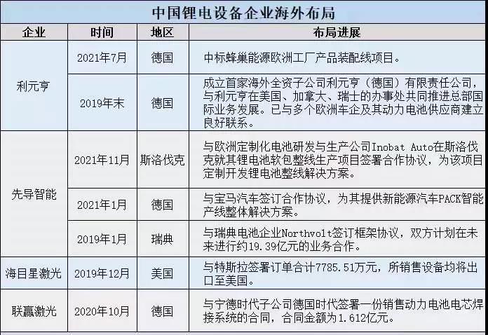 此外,隨著國內頭部設備企業(yè)進入國際一線電池企業(yè)供應鏈,“出?!彼俣纫苍诩涌?,利元亨、海目星激光、先導智能、嘉拓智能、聯(lián)贏激光等領先裝備企業(yè)已經進入國際車企/動力電池巨頭供應鏈,全球化路徑逐漸延伸至遠。