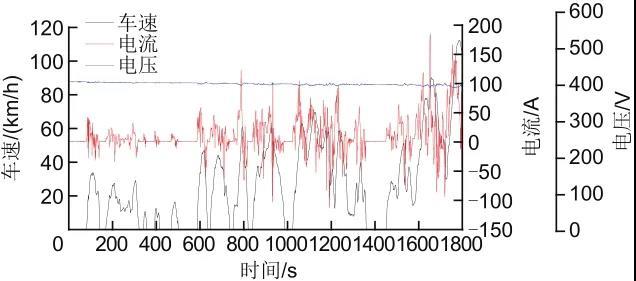 圖1 中國(guó)汽車行駛工況下某車型動(dòng)力電池電流/電壓隨時(shí)間變化