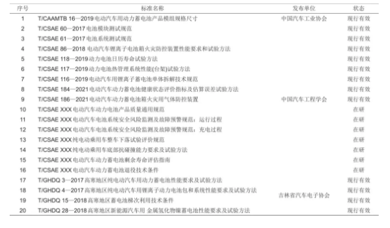 以中國(guó)汽車工業(yè)協(xié)會(huì)、中國(guó)汽車工程學(xué)會(huì)、吉林省汽車電子協(xié)會(huì)等為代表的行業(yè)組織積極開展動(dòng)力電池團(tuán)體標(biāo)準(zhǔn)研制工作,標(biāo)準(zhǔn)內(nèi)容涉及動(dòng)力電池規(guī)格尺寸、低溫電性能、壽命、熱管理系統(tǒng)性能、安全性以及梯次利用等,成為現(xiàn)有動(dòng)力電池標(biāo)準(zhǔn)體系的有益補(bǔ)充。見表2。