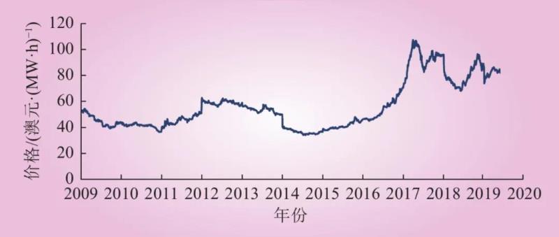 2009—2019年NSW基荷期貨結(jié)算價(jià)格變化情況如圖2所示??梢钥闯觯谪泝r(jià)格基本上反映了2015年以后澳大利亞大量建設(shè)風(fēng)光等新能源帶來的電價(jià)上漲趨勢(shì)。這表明澳大利亞的期貨市場(chǎng)有助于實(shí)現(xiàn)其中遠(yuǎn)期價(jià)格發(fā)現(xiàn)的功能。