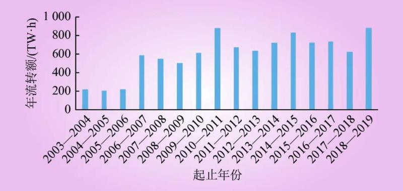 根據(jù)IEA和AFMA的數(shù)據(jù),2018—2019年,澳大利亞場(chǎng)內(nèi)交易的電力期貨達(dá)到891 829 GW?h,是現(xiàn)貨市場(chǎng)體量的3.5倍。圖1是2003—2019年AFMA統(tǒng)計(jì)的電力期貨合約年度流轉(zhuǎn)額,可以反映出期貨的流動(dòng)性良好,呈現(xiàn)較穩(wěn)定的增長(zhǎng)趨勢(shì)。