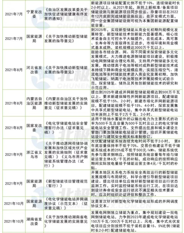 在雙碳戰(zhàn)略目標(biāo)下,能源清潔化是核心。2021年以來各地都陸續(xù)發(fā)布文件啟動新能源“倍增計劃”,電源側(cè)多能互補(bǔ)、一體化、大基地模式成為新的發(fā)展趨勢。新能源發(fā)電的靠天吃飯?zhí)匦灾饾u成為其發(fā)展瓶頸,同時也是電源側(cè)儲能難以實現(xiàn)商業(yè)化的突破口。2021年全國各省市新能源配套儲能需求多達(dá)29項,各地26項儲能主題文件中大多提及了鼓勵以共享或租賃形式建設(shè)儲能節(jié)約成本,但真正最有利的推手當(dāng)屬新版兩個細(xì)則。